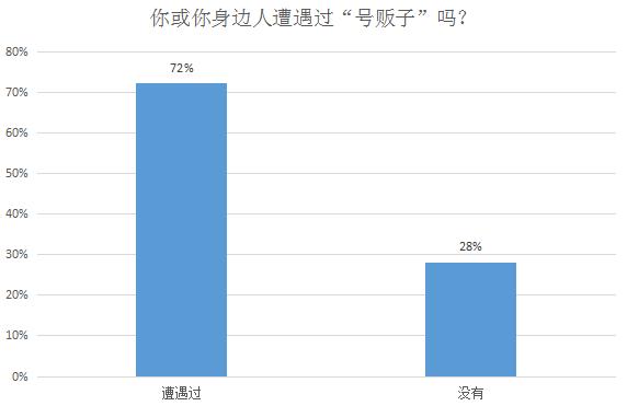 今年春節(jié)期間,女孩怒斥“號(hào)販子”的視頻讓“號(hào)販子”重新進(jìn)入公眾視野。但是“號(hào)販子”是一個(gè)偶然存在和極個(gè)別的現(xiàn)象嗎?從調(diào)查來(lái)看,顯然不是。72%的被調(diào)查者表示自己或身邊人遭遇過(guò)“號(hào)販子”。(據(jù)本編親身經(jīng)歷,貌似北京著名三甲醫(yī)院前都遍布著“號(hào)販子”……)
