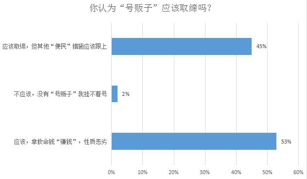 但也有2%的人認(rèn)為不應(yīng)該,因?yàn)椤疤?hào)販子”的存在可以幫助掛上號(hào)。正常情況下,沒(méi)有人會(huì)愿意多花10倍、20倍的錢(qián),這2%的人大概也是被“掛號(hào)難”逼的……
