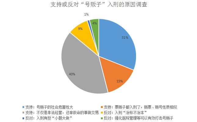 支持一方中,40%的被調(diào)查者認(rèn)為“號(hào)販子”不僅是非法經(jīng)營(yíng),還拿救命的事做交易;31%的被調(diào)查者認(rèn)為目前其違法成本與非法所得相比太低;還有15%的網(wǎng)友認(rèn)為“票販子”都入刑了,“號(hào)販子”也應(yīng)該參照同等處罰力度。