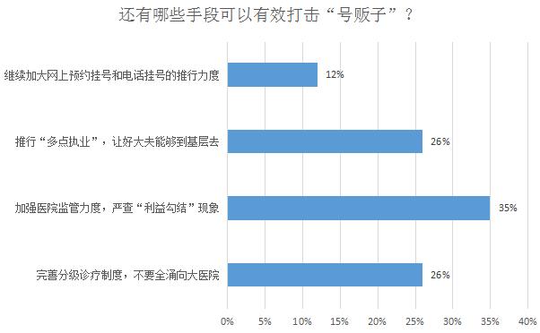 在打擊“號(hào)販子”問(wèn)題上,35%的被調(diào)查者選擇應(yīng)該嚴(yán)查“利益勾結(jié)”現(xiàn)象,此外還有相當(dāng)一部分網(wǎng)友希望推行“多點(diǎn)執(zhí)業(yè)”和分級(jí)診療制度,讓患者進(jìn)行分流,從而減少對(duì)“號(hào)販子”的購(gòu)買(mǎi)需求,沒(méi)有了市場(chǎng)自然“號(hào)販子”也會(huì)轉(zhuǎn)行了。