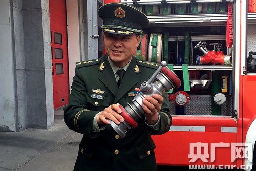 海淀消防支隊(duì)雙榆樹中隊(duì)指導(dǎo)員戴亞強(qiáng)介紹消防設(shè)備 央廣網(wǎng)記者高藝寧攝