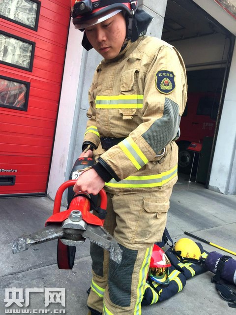 海淀消防支隊(duì)雙榆樹中隊(duì)副中隊(duì)長李澤宇演示消防破拆工具 央廣網(wǎng)記者高藝寧攝