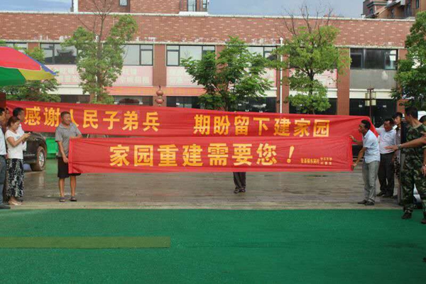 8月9日下午17時40分,在武警水電二支隊安徽東至縣搶險臨時營區(qū)門口,十幾名當?shù)厥転娜罕娎鹆恕案兄x人民子弟兵,期盼留下建家園”“家園重建需要您”等橫幅,送來了“情系張溪人民,盡顯鐵軍風采”“危難關頭伸援手,大愛無疆戰(zhàn)洪魔”兩面錦旗,到部隊“請愿”,請求官兵們留下來,繼續(xù)幫助當?shù)馗愫脼暮笾亟ā?/p>