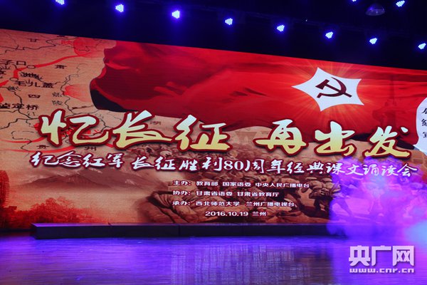 央廣網(wǎng)蘭州20日消息(記者 王丹蕾) 19日,由教育部、國家語言文字工作委員會、中央人民廣播電臺主辦,甘肅省教育廳、甘肅省語言文字工作委員會協(xié)辦,西北師范大學(xué)、蘭州廣播電視臺承辦的“憶長征 再出發(fā)——紀(jì)念紅軍長征勝利80周年經(jīng)典課文誦讀會”在西北師范大學(xué)音樂廳舉行。
