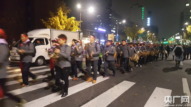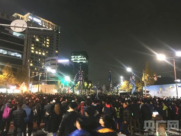 17時(shí)起,韓國民眾開始進(jìn)行大規(guī)模示威游行活動(dòng)。游行以隔空包圍總統(tǒng)府青瓦臺(tái)的形式進(jìn)行,從首爾廣場出發(fā),經(jīng)過鐘路、西大門、乙支路等地。