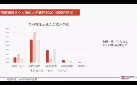 2016年5月,北京交通大學(xué)、阿里巴巴研究院、菜鳥網(wǎng)絡(luò)聯(lián)合發(fā)布《全國(guó)社會(huì)化電商物流從業(yè)人員研究報(bào)告》顯示,53.4%的快遞站點(diǎn)員工月平均工資在2000-4000元;近八成一線快遞員日均工作9-10小時(shí),有些甚至12小時(shí)以上。