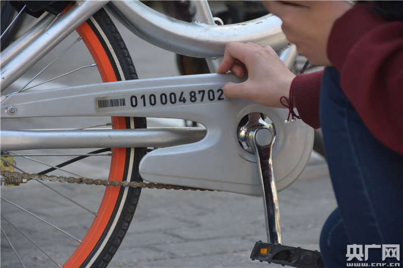 共享單車車牌號被人涂抹了,海燕在幫它刮干凈。圖片拍攝:央廣網(wǎng)實習(xí)記者 陳銳海