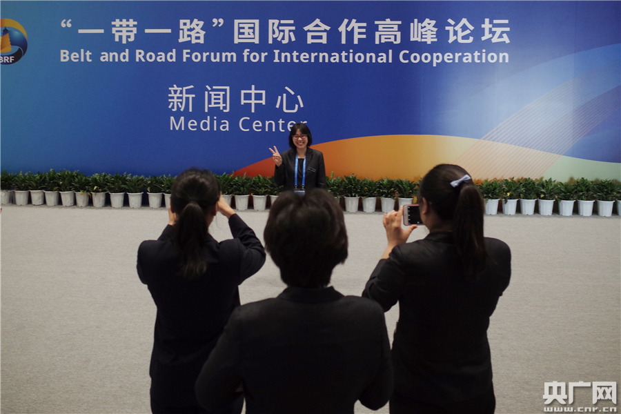 在“一帶一路”國(guó)際合作高峰論壇新聞中心內(nèi),工作人員們紛紛合影留念。(央廣網(wǎng)記者 王永康 攝) -