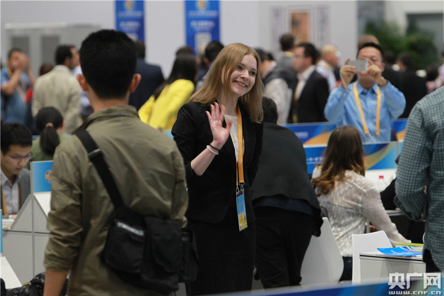在“一帶一路”國(guó)際合作高峰論壇新聞中心內(nèi),一名記者揮手告別。(央廣網(wǎng)記者 韓靖 攝) -