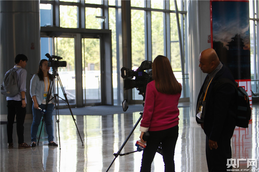 在“一帶一路”國(guó)際合作高峰論壇新聞中心內(nèi),記者在進(jìn)行采訪。(央廣網(wǎng)記者 王永康 攝) -