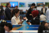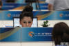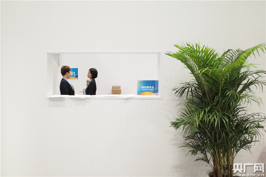 在“一帶一路”國(guó)際合作高峰論壇新聞中心內(nèi),兩名工作人員在預(yù)訂服務(wù)臺(tái)窗口交流工作。(央廣網(wǎng)記者 王永康 攝) -