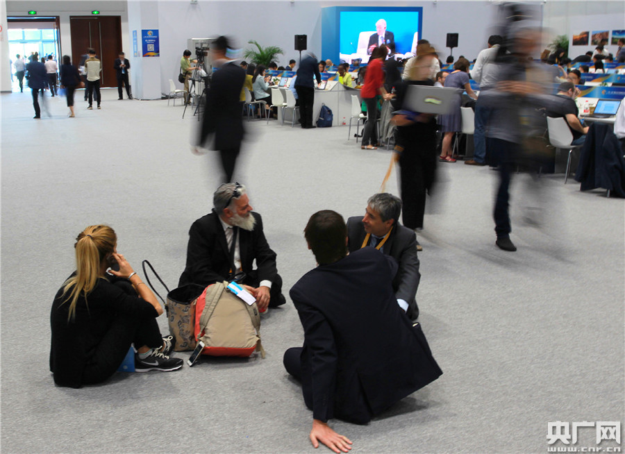 在“一帶一路”國(guó)際合作高峰論壇新聞中心內(nèi),記者們席地而坐,交流工作。(央廣網(wǎng)記者 韓靖 攝) -