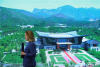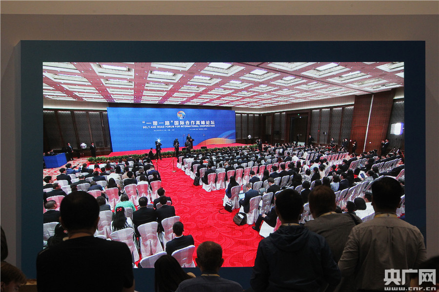 在“一帶一路”國(guó)際合作高峰論壇新聞中心內(nèi),一名記者正在背景為北京雁棲湖國(guó)際會(huì)議中心的電子屏幕前出鏡。(央廣網(wǎng)記者 韓靖 攝) -
