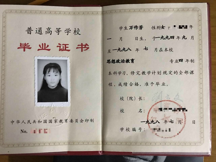 1994級(jí)考生萬(wàn)作芳的大學(xué)畢業(yè)證書(shū)