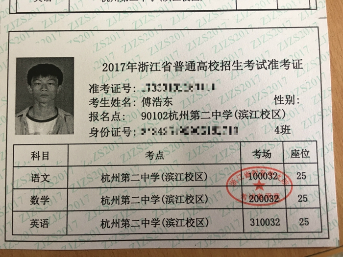 2017級(jí)考生傅浩東的準(zhǔn)考證