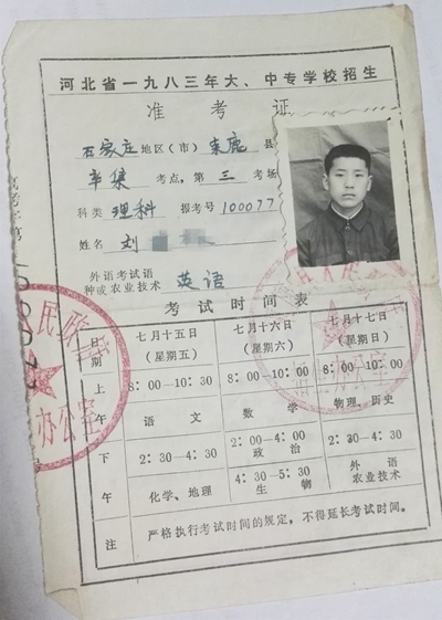 1983年劉靜心(化名)參加高考時(shí)所用的準(zhǔn)考證,他一直珍藏到現(xiàn)在。