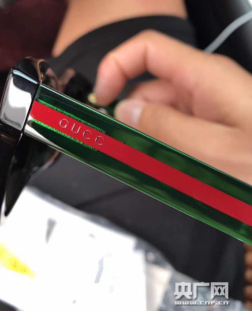 8月16日,來到北京維權(quán)的馮先生向記者展示了“Gucc”眼鏡圖片。圖片中,鏡腿上清晰的印著“Gucc”四個(gè)字母,而“i”卻不見了蹤影。