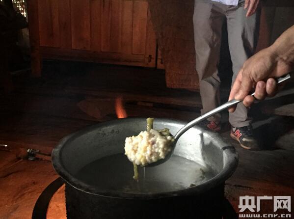 20平米左右的一間屋子,陰暗潮濕,站在屋內(nèi)都都看不清對(duì)面人臉模樣,中間用柴火支起的鍋里正煮著苞谷粥。腳下的木板發(fā)出吱吱嘎嘎的響聲,橫梁上掛著一串串從山上采下曬干的豆子。幾個(gè)柜子白天放著一些雜物和被子,晚上就是老兩口的床!皟鹤雍蛢合弊≡谙旅娴呐镒永铩,門大爺對(duì)記者說(shuō)到。