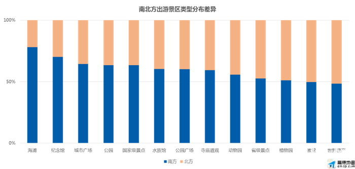 此外,從南北方景區(qū)出游類型分布差異上看,十一黃金周期間預(yù)計南方的出游用戶比例將高于北方,其中受溫度影響,海灘游南方將明顯高于北方,而在世界遺產(chǎn)、教堂類景區(qū)的出游占比上,北方則偏高于南方。