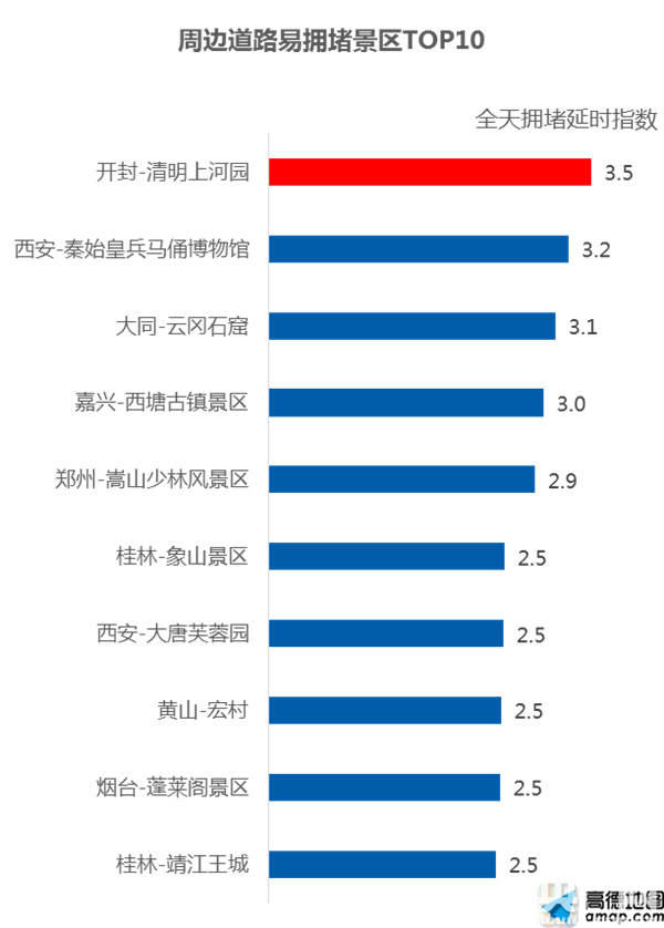 在火車站方面,從高德地圖交通大數(shù)據(jù)預(yù)測的全國主要火車站周邊道路擁堵數(shù)據(jù)分析看,十一長假期間,西安站、青島站、哈爾濱站周邊道路擁堵程度最高,其中西安站周邊在十一期間的擁堵延時指數(shù)達到了2.5,青島站和哈爾濱站也達到了2.1,出行所需花費的時間成本較大。
