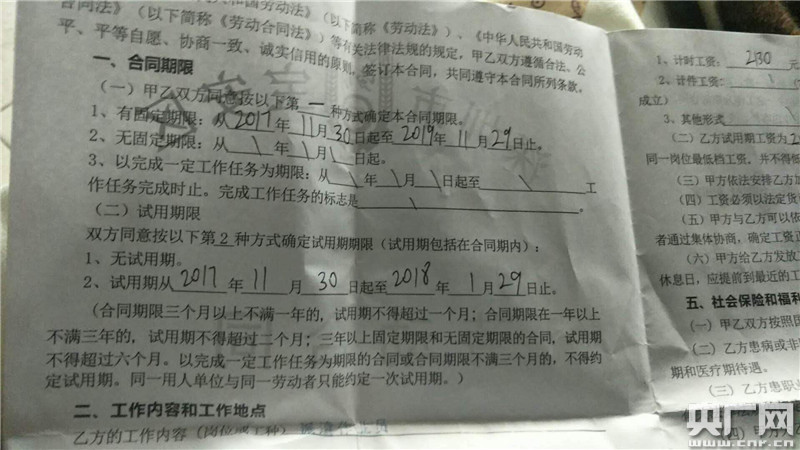 根據(jù)趙程提供的勞務(wù)合同照片,記者看到合同期限一欄明確寫有“有固定期限:從2017年11月30日起至2019年11月29日止。試用期限從2017年11月30日到起至2018年1月29日止!