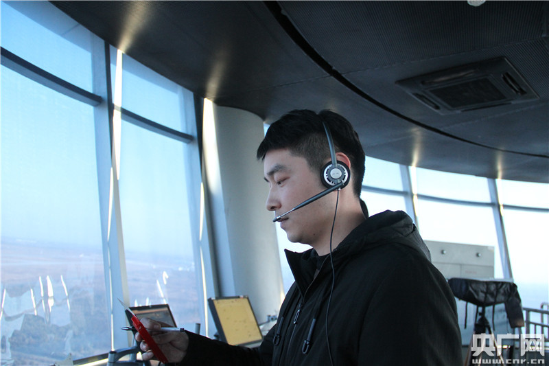 新橋機(jī)場塔臺管制員王俊俊指揮飛機(jī)起降(央廣網(wǎng)記者 高藝寧 攝)
