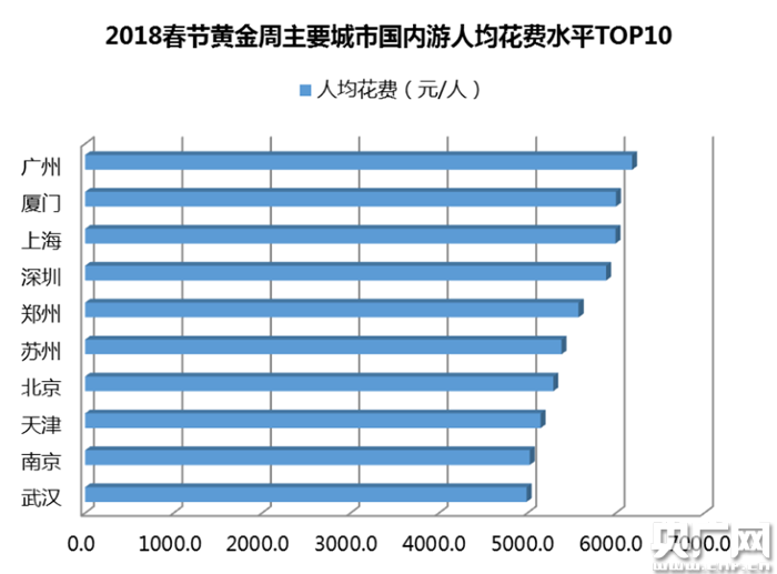 記者根據(jù)上述數(shù)據(jù)報(bào)告還發(fā)現(xiàn),在旅游消費(fèi)水平上,全國游客用于購買旅游產(chǎn)品(交通、住宿、線路等)的人均支出接近4000元/人,相比往年進(jìn)一步提高。其中,春節(jié)黃金周出游人均花費(fèi)水平最高的前十個城市依次為:廣州、廈門、上海、深圳、鄭州、蘇州、北京、天津、南京、武漢,人均花費(fèi)基本都在5000元/人以上。