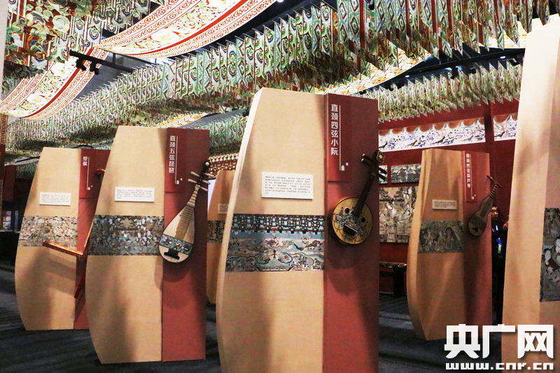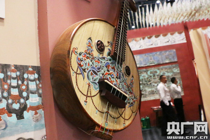天籟敦煌展區(qū)陳列的敦煌壁畫仿制樂器“直頸四弦小阮”。 (央廣網(wǎng)記者 張喬 攝)