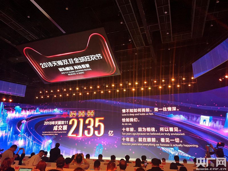 2018年天貓雙11最終成交額2135億。(央廣網(wǎng)記者梁爽攝)