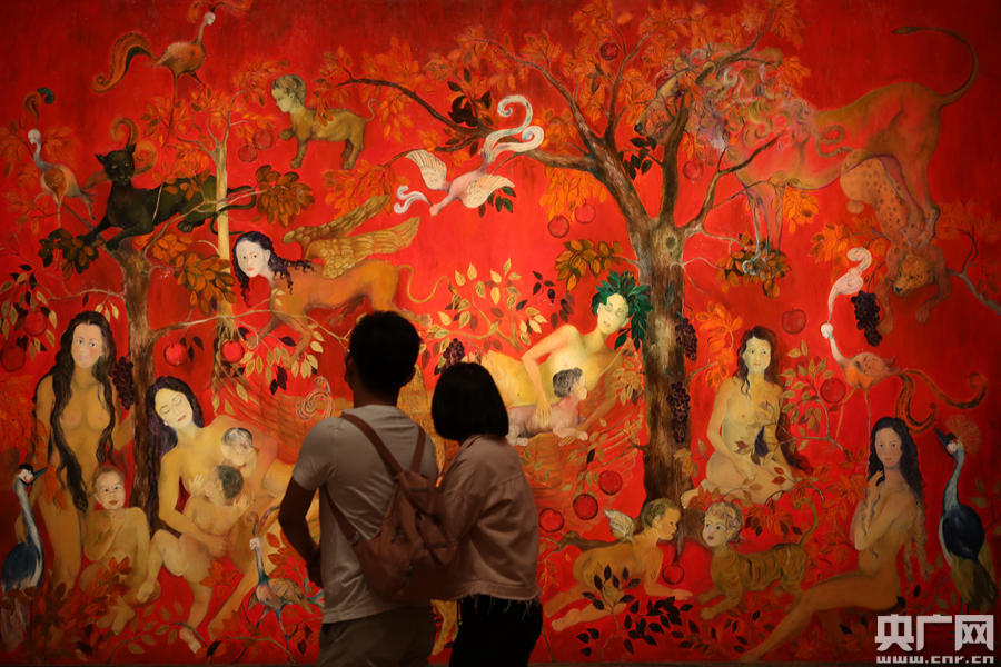 在“美人之美”展區(qū)的作品前,觀眾駐足觀看。(央廣網(wǎng)記者 韓靖 攝)