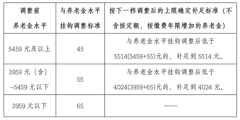 此外,退休人員2018年年底前的月基本養(yǎng)老金由高到低劃分三檔,5459元(含)以上的每人每月增加45元;3959元(含)~5459元之間的每人每月增加55元;3959元以下每人每月增加65元。通過采取低者高調、高者低調的方式,保障待遇水平偏低的人員能夠適當多增加基本養(yǎng)老金(如下圖所示)。