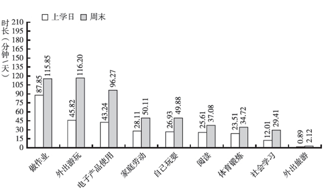 《藍(lán)皮書》調(diào)查顯示,在上學(xué)日,平均每個兒童的校外生活時間分配中,花費時間最多的類別是完成作業(yè)(包括學(xué)校作業(yè)、課外班作業(yè)、家長布置的作業(yè)、其他作業(yè)),占時87.85分鐘(其中學(xué)校作業(yè)平均占時62分鐘);其次是外出游玩(45.82分鐘),其中,占時最多的是去公園、小區(qū)露天場所等公共場所(18.59分鐘);再次是電子產(chǎn)品的使用(43.24分鐘),其中,利用電子產(chǎn)品娛樂時間(包括抖音、動畫片、快手等)最長(16.60分鐘),進(jìn)行學(xué)習(xí)(包括電子書、App學(xué)習(xí)、網(wǎng)絡(luò)課程等)的時間為13.90分鐘,利用電子產(chǎn)品玩游戲、網(wǎng)絡(luò)聊天(包括網(wǎng)絡(luò)游戲、QQ、微博、微信等)的時間為12.75分鐘。