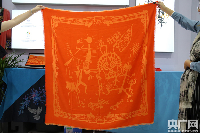 江蘇桑蠶絲和寧夏羊絨混紡織成的賀蘭山巖畫圖案圍巾。(中央廣播電視總臺央廣記者 王新宇 攝)