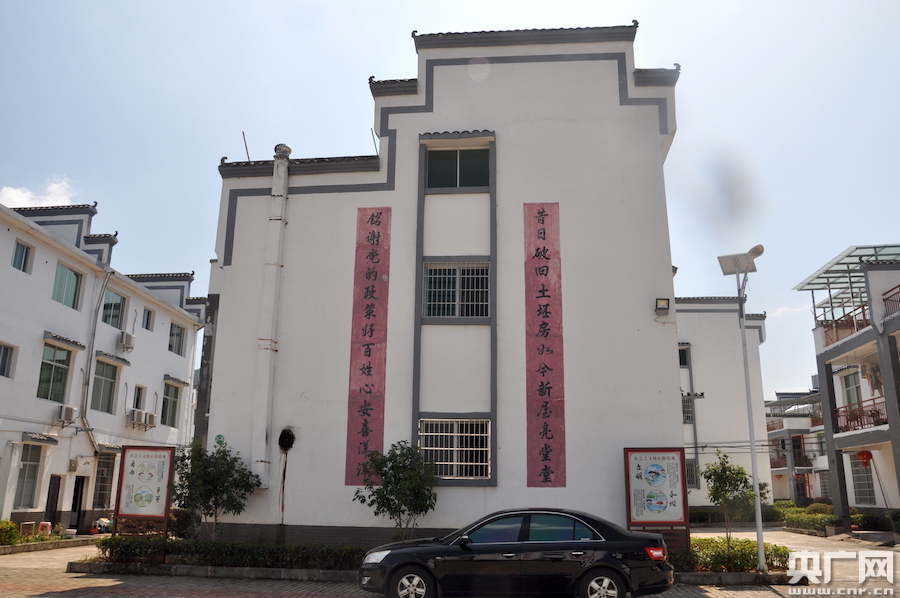 一棟華屋村民居住的三層小樓外,印刷著“昔日破舊土坯房如今新屋亮堂堂,銘謝黨的政策好百姓心中喜洋洋”的字樣(央廣網(wǎng)記者 王子衿 攝)