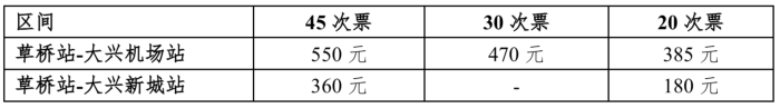 電子計次票主要包括:草橋站至大興機場站區(qū)段,45次票550元、30次票470元、20次票385元三種;草橋站至大興新城站區(qū)段,45次票360元、20次票180元兩種。乘客可結(jié)合自身出行的區(qū)間及次數(shù)需求,選擇購買相應的區(qū)間、次數(shù)的電子計次票。