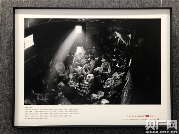第一次在中國鐵路春運(yùn)史上,以貨車棚車來替代客車進(jìn)行長途旅客運(yùn)輸。該圖片展示于國家鐵路集團(tuán)一樓展廳(央廣網(wǎng)記者 王晶 攝)