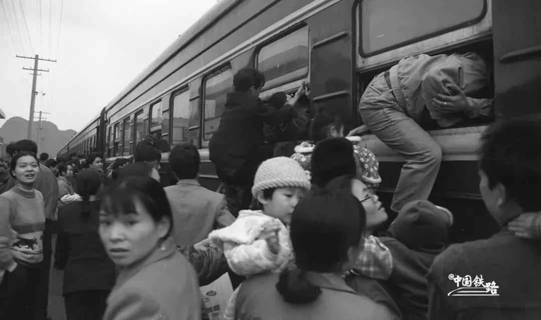 1998年,湘桂線鳳凰站,沒能從車門擠進(jìn)去的旅客干脆從車窗爬進(jìn)列車(中國鐵路供圖 蔣建雄 攝)