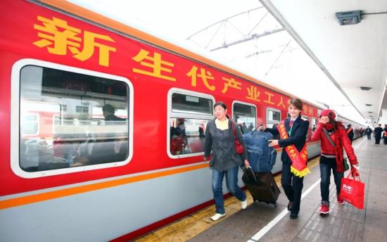 2012年春運(yùn),新一代農(nóng)民工返鄉(xiāng)專列開行(廣州鐵路供圖)