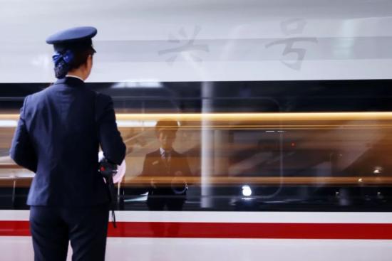 2019年1月21日,深圳北站一列開往香港的復(fù)興號動車組啟動,客運(yùn)值班員正在進(jìn)行送車作業(yè)(中國鐵路供圖)
