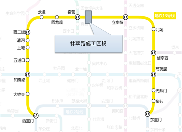 交通部門預(yù)計(jì),本次林萃路施工總共工程時(shí)長為186小時(shí),1月30日(正月初六)首班車起,地鐵13號線全線恢復(fù)正常運(yùn)營。由于林萃路建設(shè)需段行13號線1、2號出入段線,若西直門至回龍觀站區(qū)間正常運(yùn)營,13號線車輛將無法回車輛段進(jìn)行檢修。因此,施工期間13號線西段(西直門站-霍營站區(qū)間)將暫停運(yùn)營。立水橋附近設(shè)有地鐵車輛段折返線路,可滿足列車正常運(yùn)營、檢修需求,東直門站-立水橋站區(qū)間正常運(yùn)營。