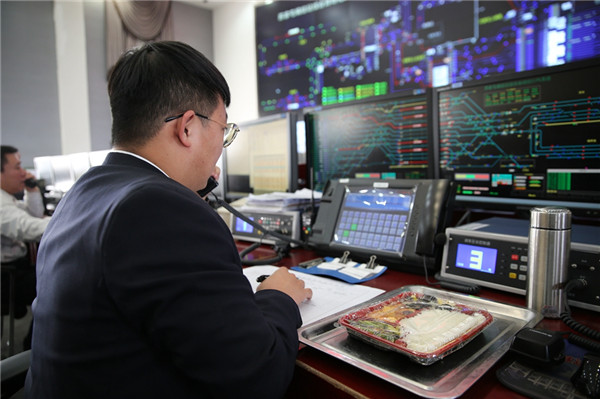12點30分,值班員劉宇雙眼緊盯列車運行圖,一只手輕點鼠標,另一只手端起桌上的盒飯。這份盒飯是11點送過來的,現(xiàn)在已沒了熱氣。他剛要拿起筷子吃飯,手邊的電話又響了……為了隨時監(jiān)控列車運行,他們工作餐需要在調度臺前吃。