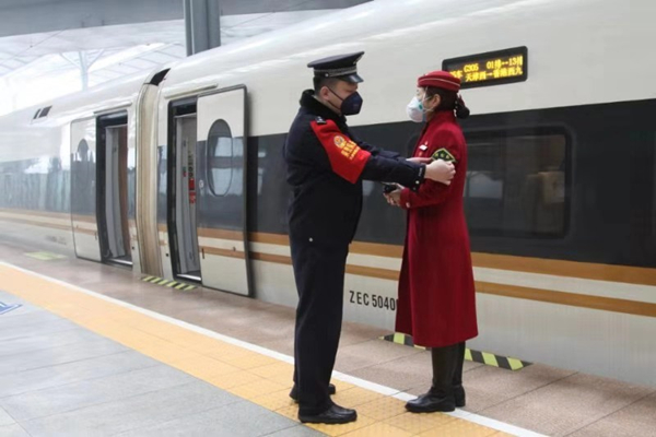 隨著武漢疫情的不斷加劇,張棕鵬將更多的精力放到所轄2對(duì)途徑武漢的高鐵列車(chē)上。1月30日一大早,張棕鵬來(lái)到天津西站,專(zhuān)門(mén)到站臺(tái)送G305/6次列車(chē)。G305/6次列車(chē)是新開(kāi)行線路,乘警也是剛?cè)刖哪贻p同志。他擔(dān)心青年民警心理壓力大,專(zhuān)門(mén)學(xué)習(xí)了新型冠狀病毒傳播的知識(shí),給青年民警疏導(dǎo)減壓;他又怕青年民警遇到感染病毒旅客,不注重方式方法蠻干感染上病毒,再三叮囑做好自身防護(hù)。今天碰巧,列車(chē)長(zhǎng)就是他妻子滿運(yùn)媛。列車(chē)臨行了,張棕鵬為她整理了一下列車(chē)長(zhǎng)袖標(biāo),簡(jiǎn)單說(shuō)了一句“你也要注意自身安全”。邊應(yīng)答著,滿運(yùn)媛邊為丈夫也整理了一下衣領(lǐng)。