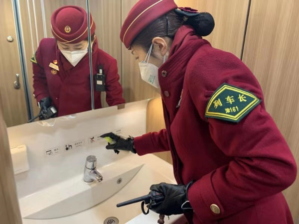 G305/6次列車(chē)中間停10個(gè)車(chē)站,單程2450千米,特別是途徑河南、湖北、湖南、廣州等幾個(gè)疫情重災(zāi)區(qū),維護(hù)旅客安全出行的責(zé)任極為重大。特別是天津市啟動(dòng)應(yīng)對(duì)新型冠狀病毒感染肺炎一級(jí)響應(yīng)后,要求到天津的乘客全部測(cè)量體溫,滿運(yùn)媛的工作量陡然上升。在做好日常乘務(wù)的同時(shí),要對(duì)入津乘客全覆蓋測(cè)量體溫,并對(duì)列車(chē)重點(diǎn)部位進(jìn)行消毒,這讓她瘦弱的身軀有點(diǎn)吃不消,值乘回家需要大量的休息恢復(fù)體能。