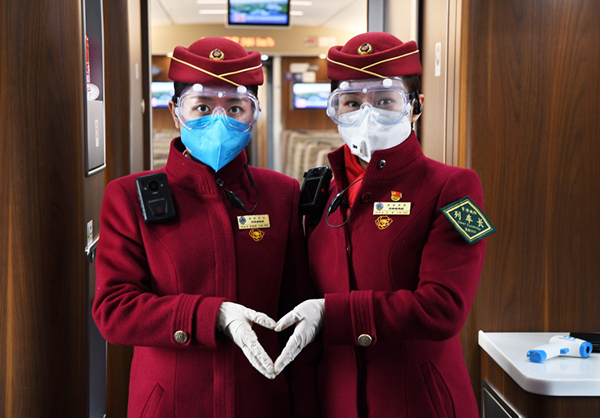 1月31日,京津城際列車乘務員做好自身安全防護兩人做了一個“心”的手勢象征著“加油”(北京鐵路供圖 楊寶森 攝)