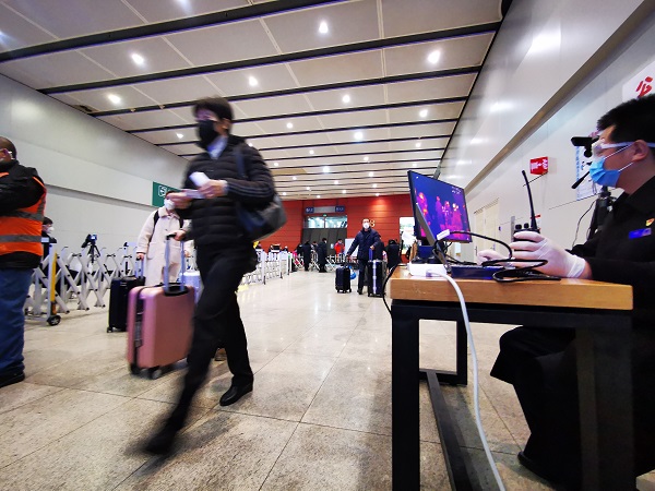 北京南站進(jìn)出站人員通過門式測(cè)溫儀和固定式紅外測(cè)溫儀,工作人員實(shí)時(shí)監(jiān)看設(shè)備(北京鐵路供圖)