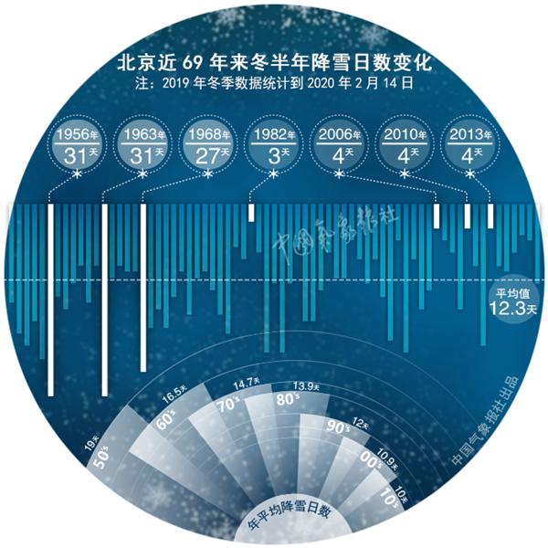 從觀感上看,很容易給人今冬降雪頗多的感覺。但從氣象學(xué)角度來看今冬的雪真的多嗎?記者梳理從1951年至今69年北京冬季的雪日數(shù)據(jù)發(fā)現(xiàn),北京冬季觀測到的降雪最多的年份為1956年和1963年冬,共有33天,占冬季日數(shù)的37%,雪日最少的年份出現(xiàn)在1982年冬,只有3天,其次為2006、2010和2013年冬,整個(gè)冬天只有4天出現(xiàn)降雪。