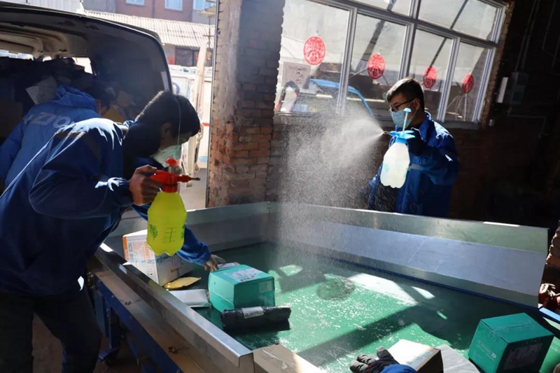 在快遞網(wǎng)點(diǎn),工作人員正在逐一對(duì)快件進(jìn)行消毒(央廣網(wǎng)發(fā) 中通快遞供圖)