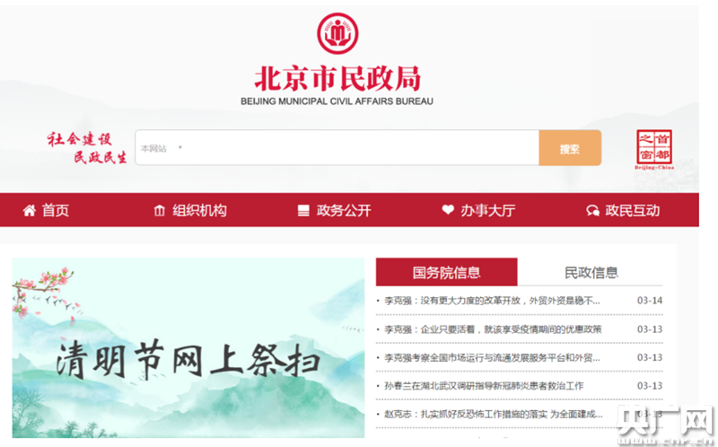 1.登錄首都之窗、北京市民政局或各區(qū)政府官方網(wǎng)站,點(diǎn)擊清明節(jié)網(wǎng)上祭掃專題。