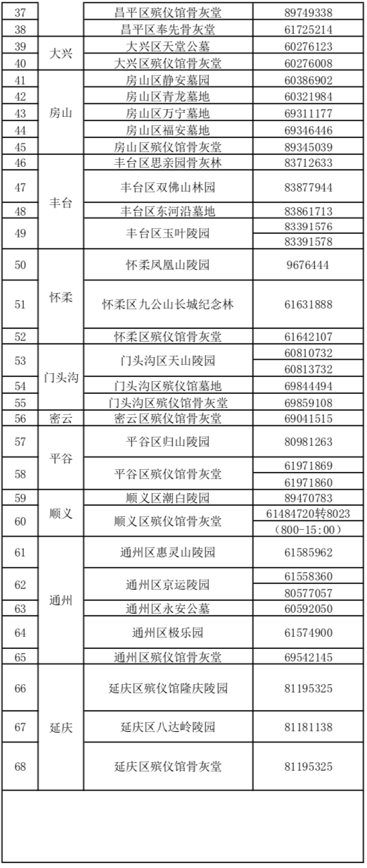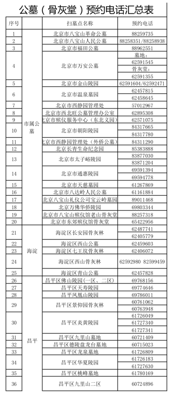 公墓(骨灰堂)預(yù)約電話匯總表(北京市民政局供圖)