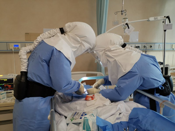 經(jīng)過與負責ICU的北京協(xié)和醫(yī)院援助湖北團隊會診,3月2日,張心浩與同事龍小博為劉英實施了氣管切開手術(shù)。